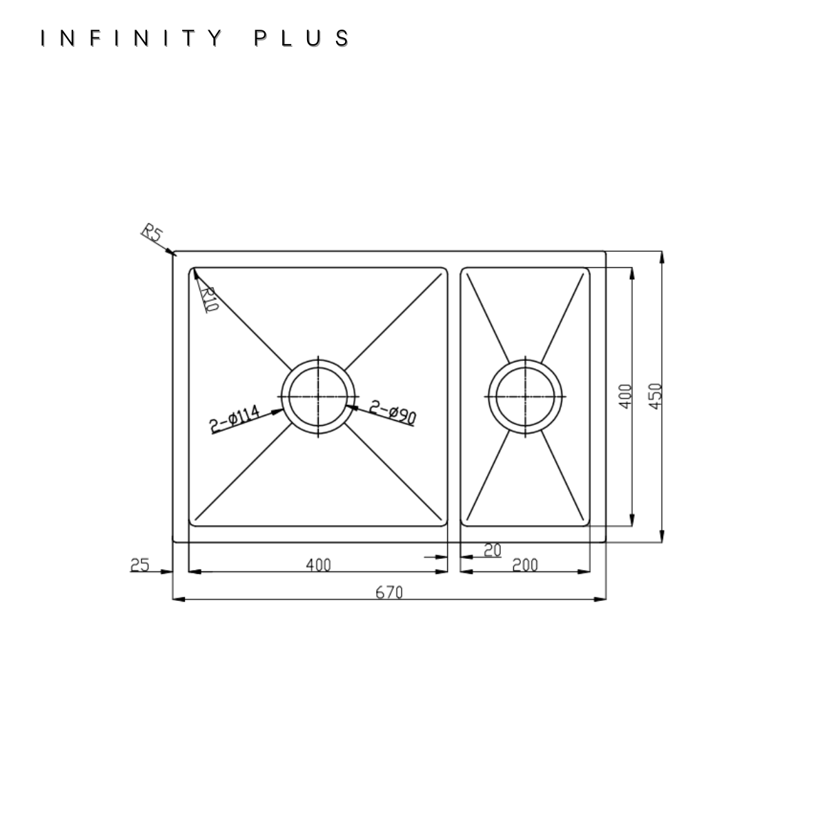 - 670 x 450 x 240mm - Functional large bowl 400 x 400mm with an extra small bowl 200 x 400mm.